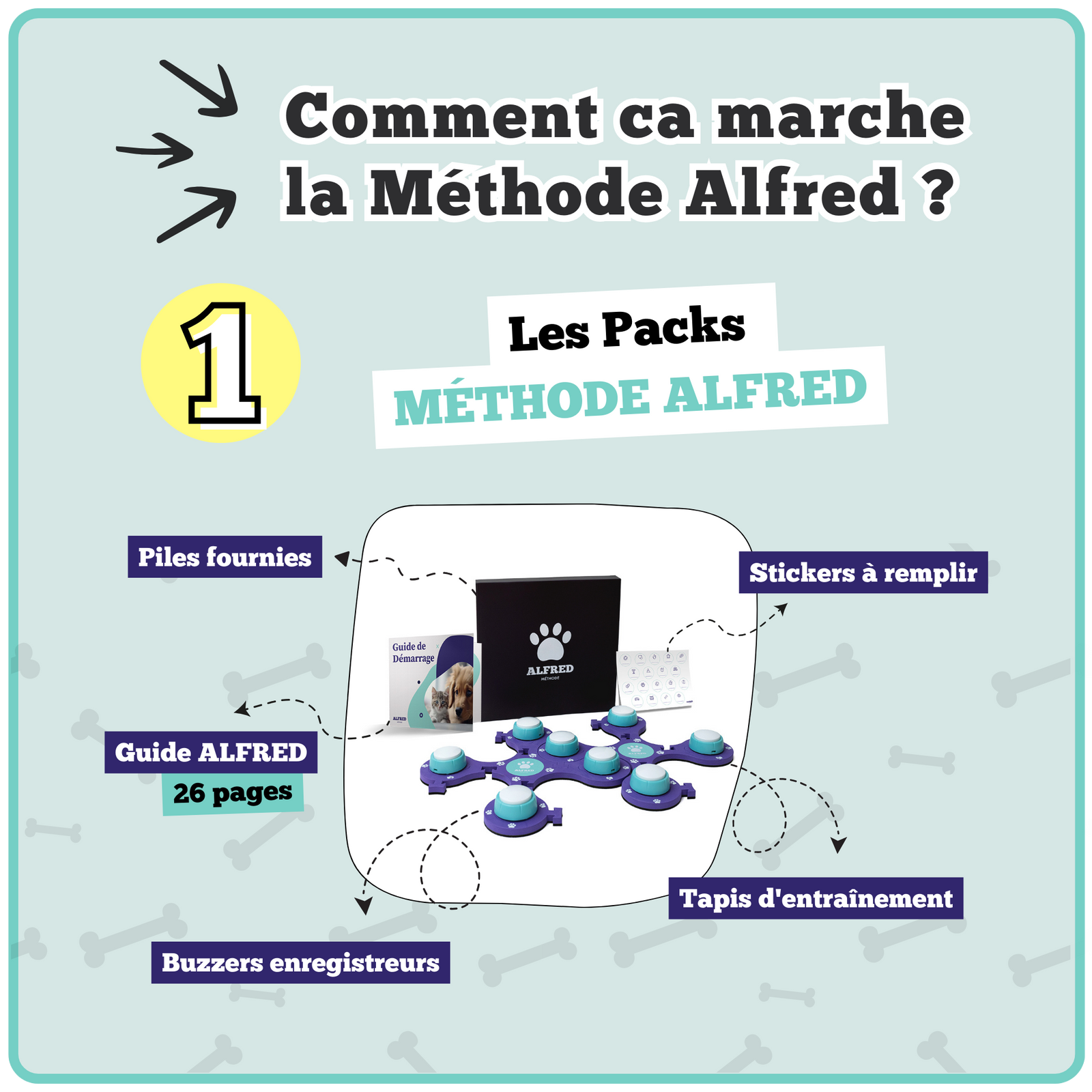 La méthode Alfred est une approche unique en quatre étapes utilisant des buzzers électroniques et des tapis de communication pour établir une connexion profonde et compréhensive avec votre chien ou votre chat.