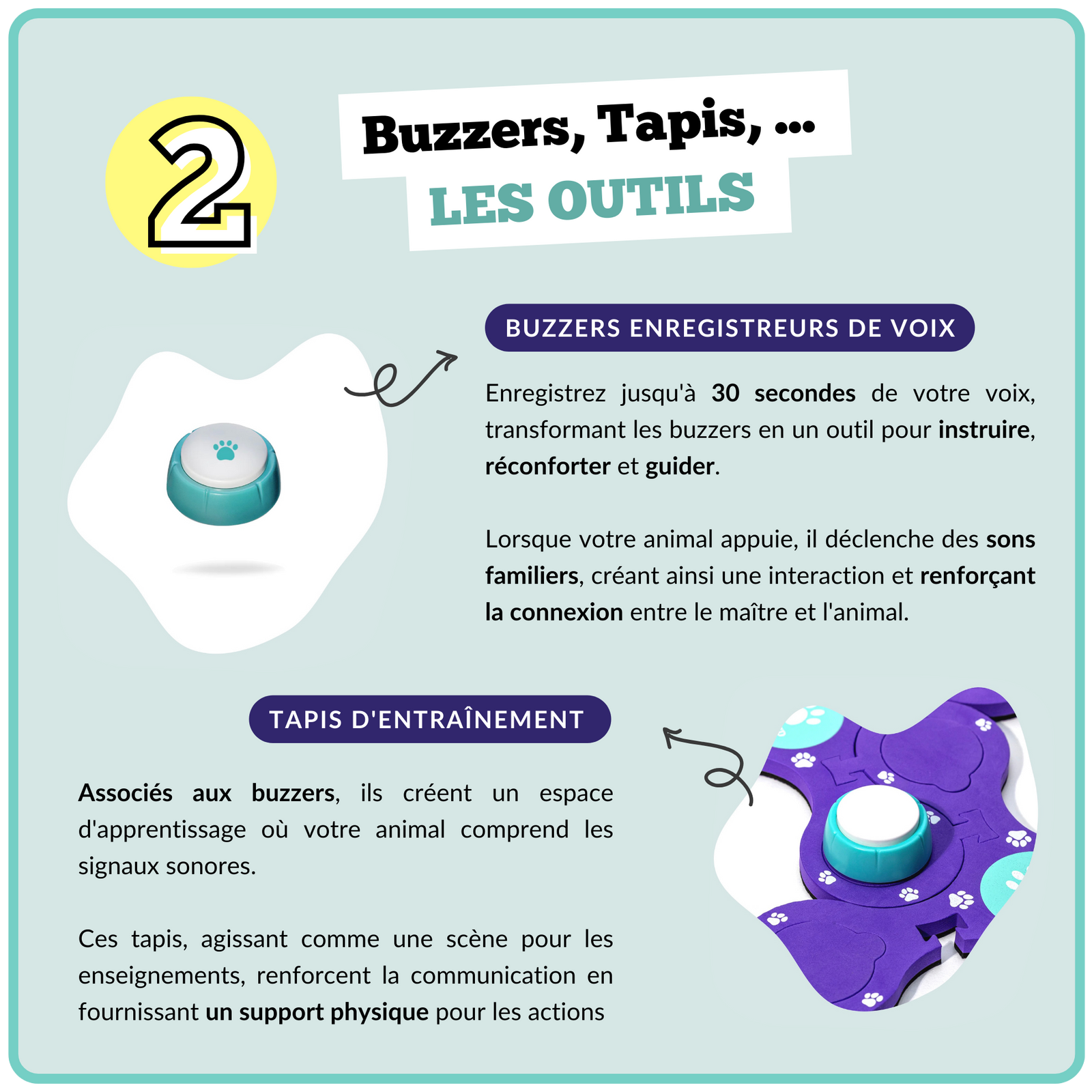 Apprenez à communiquer avec votre chien grâce à notre méthode unique en 4 étapes, utilisant des buzzers électroniques et un tapis de communication.