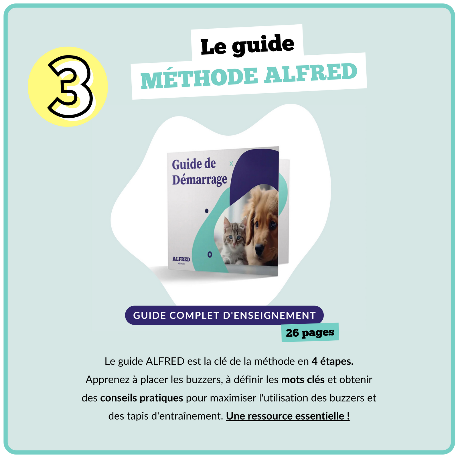 Le tapis buzzer pour chien et chat est un support visuel crucial dans la méthode Alfred.